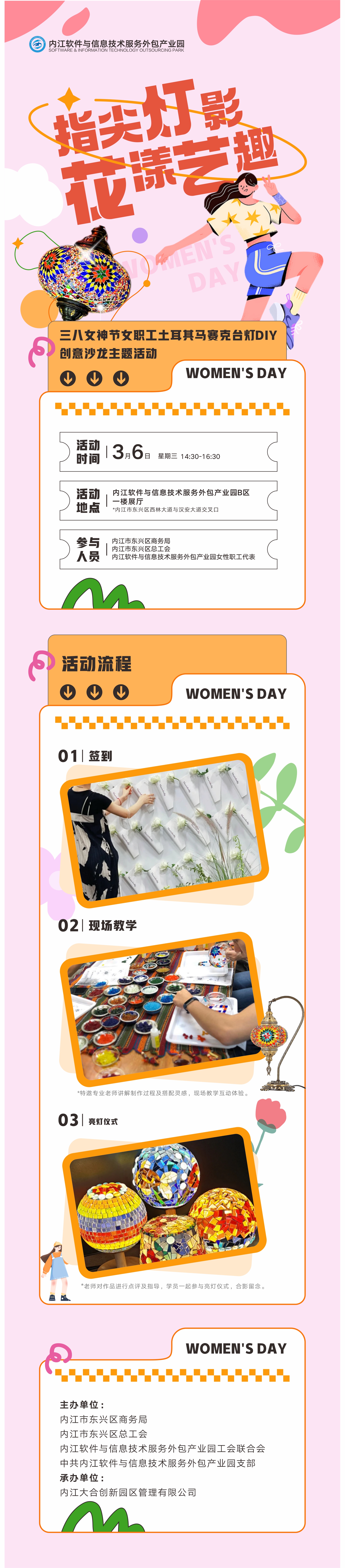 春风有信,花开有期。国际劳动妇女节,又被称为“国际妇女节”、“三八节”和“三八妇女节”。在每年3月8日为庆祝妇女在经济、政治和社会等领域作出的重要贡献和取得的巨大成就而设立的节日。为庆祝三八国际劳动妇女节,丰富园区女职工的精神文化生活,内江软件与信息技术服务外包产业园特开展“指尖灯影 花漾艺趣”——“三八”妇女节女职工土耳其马赛克台灯DIY 主题活动。