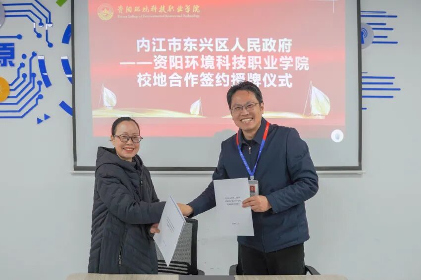 活动最后,在双方代表的共同见证下,校地合作签约授牌仪式顺利举行。此次战略合作协议的签订,标志着园区与资阳环境科技职业学院正式建立长期稳定的合作关系。